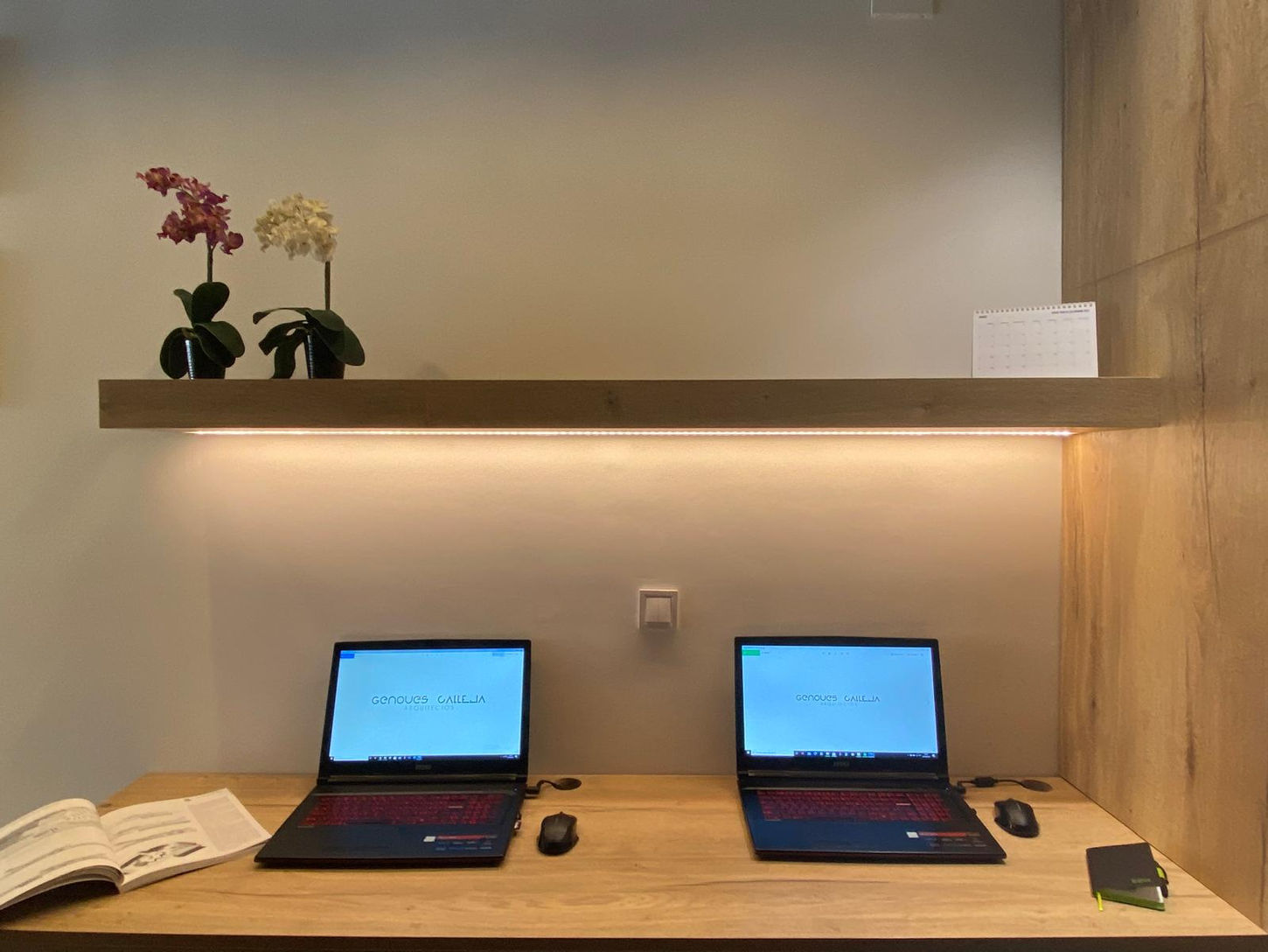 Se renueva un local para convertirlo en las oficinas propias del estudio Genovés Calleja. La propuesta utiliza revestimientos continuos y recurre a espejos para ampliar visualmente el baño. Un mueble de madera a medida organiza la zona de trabajo. La pintura petrificada imitando mármol negro integra el logotipo del estudio, y los revestimientos vinílicos aportan un toque fresco, reflejando la identidad corporativa.