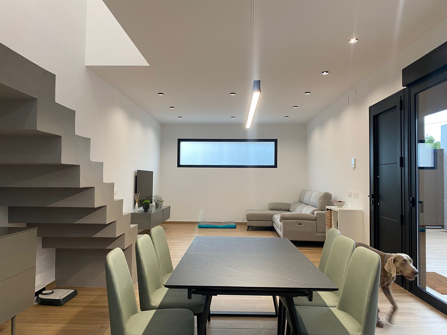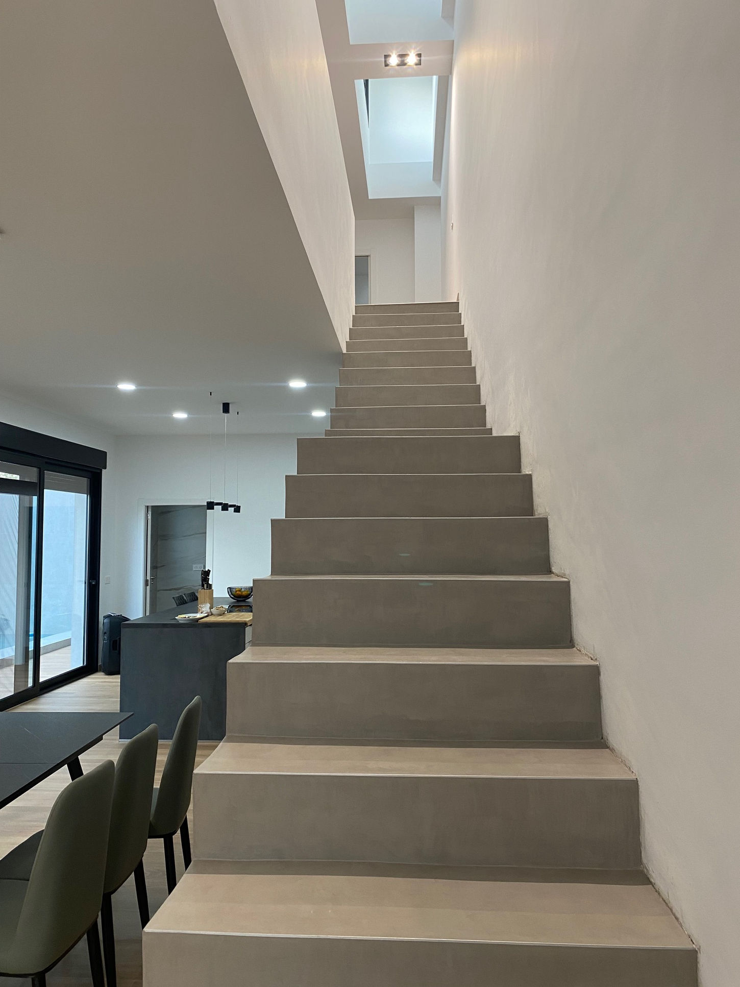 Uno de los elementos más distintivos del proyecto es la escalera de hormigón visto en zigzag, que se convierte en una pieza escultórica central, realzada por la entrada cenital de luz.